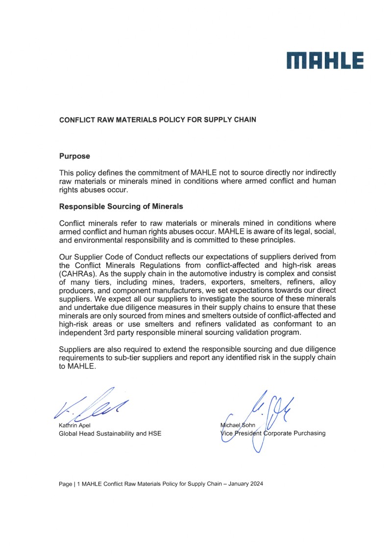 A fim de assegurar o cumprimento das disposições estatutárias e os princípios éticos dentro de sua própria base de fornecedores, a MAHLE desenvolveu o Código de Conduta do Fornecedor, aplicável a todos os fornecedores do Grupo MAHLE, responsáveis pelo cumprimento destas disposições.